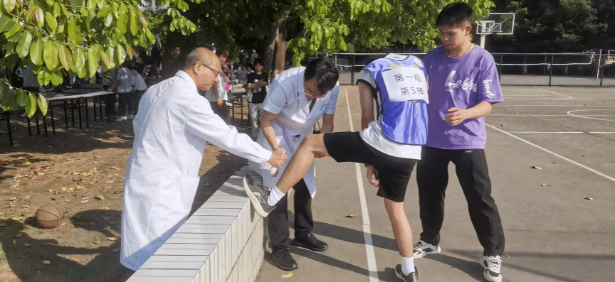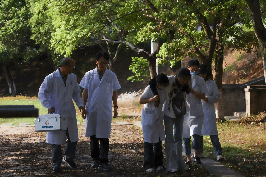 下午16时,一名学生在跑步过程中突发中暑,面色苍白、步态不稳。急救队员迅速反应,立即将其搀扶至阴凉处,解开衣领散热,用湿毛巾物理降温,同时监测体温、补充淡盐水。10分钟后,学生症状明显缓解。紧接着,另一名因热身不足导致小腿抽筋的学生,也在队员“拉伸放松+局部按摩”的专业处理下,快速缓解不适。两次应急处置中,队员们动作规范、分工明确,充分展现了扎实的急救技能。