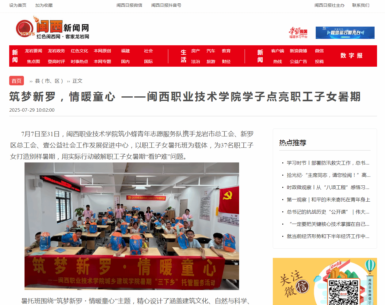 暑托班围绕“筑梦新罗・情暖童心”主题,精心设计了涵盖建筑文化、自然与科学、绘本阅读、安全教育、心理团辅、健康科普等二十多门特色课程。在课堂上,志愿者们以专业的知识、生动有趣的讲解、互动性强的教学方式,让知识“接地气”“冒热气”。课后,志愿者们化身孩子的“知心伙伴”,陪他们游戏、聊天,倾听成长的烦恼与喜悦。面对孩子们的学业困惑,志愿者们循循善诱;遇到情绪低落的孩子,他们耐心陪伴、温柔疏导。他们用青春朝气与责任担当,把暑托班变成充满爱与温暖的“成长乐园”,用青春力量传递着对职工子女的深切关怀。