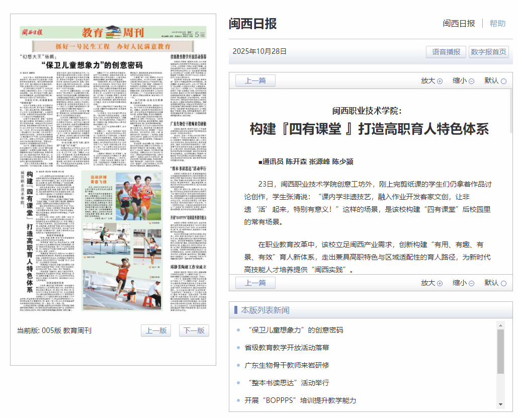 在职业教育改革中,该校立足闽西产业需求,创新构建“有用、有趣、有景、有效”育人新体系,走出兼具高职特色与区域适配性的育人路径,为新时代高技能人才培养提供“闽西实践”。