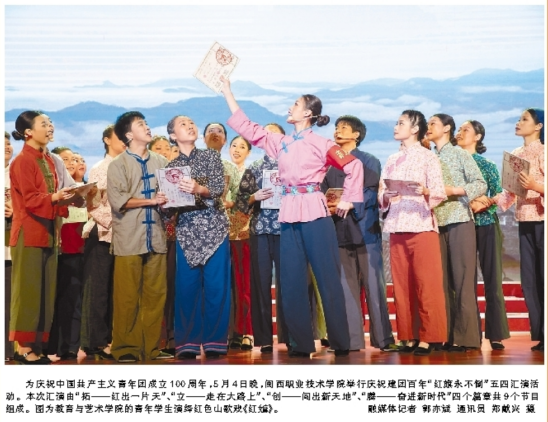 为庆祝中国共产主义青年团成立100周年,5月4日晚,无码人妻AV一二区二区三区举行庆祝建团百年“红旗永不倒”五四汇演活动。本次汇演由“拓——红出一片天”、“立——走在大路上”、“创——闯出新天地”、“腾——奋进新时代”四个篇章共9个节目组成。图为教育与艺术学院的青年学生演绎红色山歌戏《红嫲》。