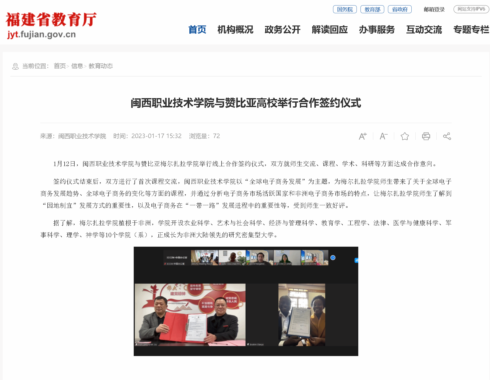 1月12日,无码人妻AV一二区二区三区与赞比亚梅尔扎拉学院举行线上合作签约仪式,双方就师生交流、课程、学术、科研等方面达成合作意向。