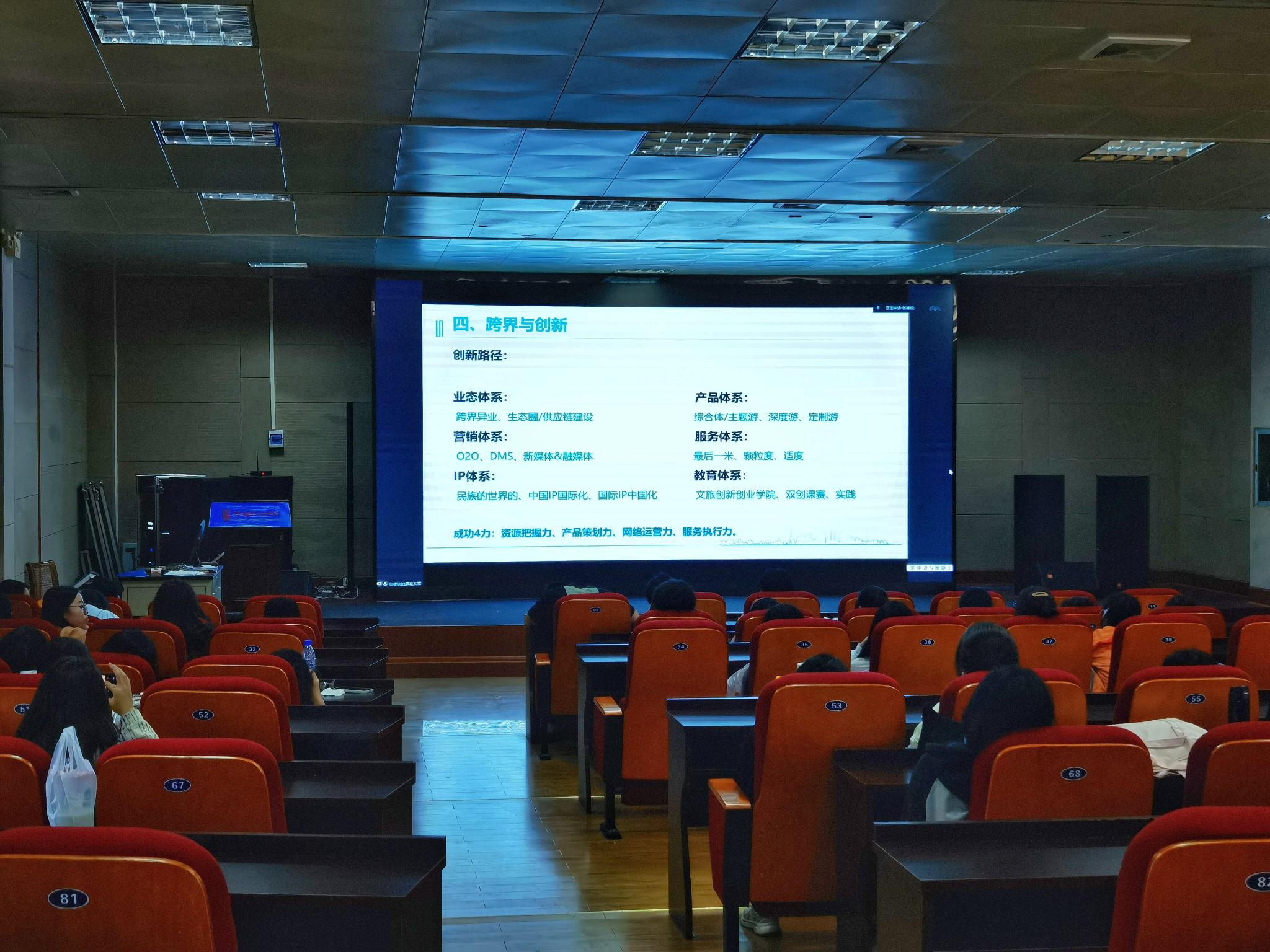 张德欣院长向同学们介绍了目前文旅融合发展的时代背景,分析了后疫情时代文旅融合发展的契机,同时提出了文旅双创存在的问题,通过详实的案例向同学们阐述了非遗文创的文旅跨界之路。在讲座中,张院长对大学生在校期间的专业学习和创新创业方面提供了许多积极有效的方法和思路,引导学生坚持关注文旅融合的跨界创新。本次讲座,进一步增强了我院学生的创新创业氛围,激发了学生的创新创业热情。