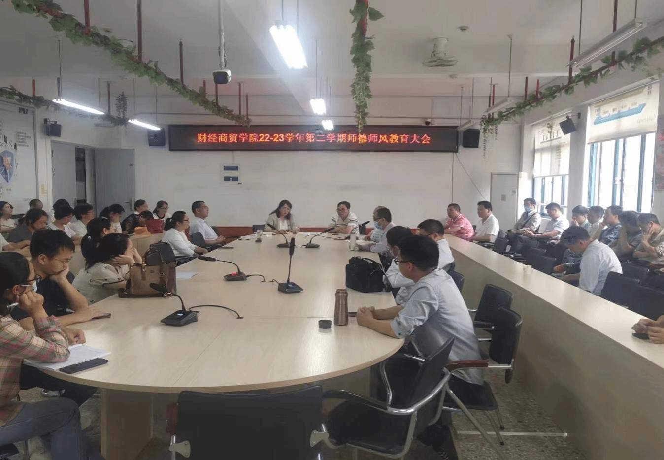 为加强教师队伍建设,提高教师自身修养,弘扬新风正气,增强教书育人,以身立教的社会责任感和使命感,财经商贸学院于2023年5月9日下午在万源楼召开"师德师风教育大会",会议由院党委书记李宝生主持,全院教职员工参加了大会。