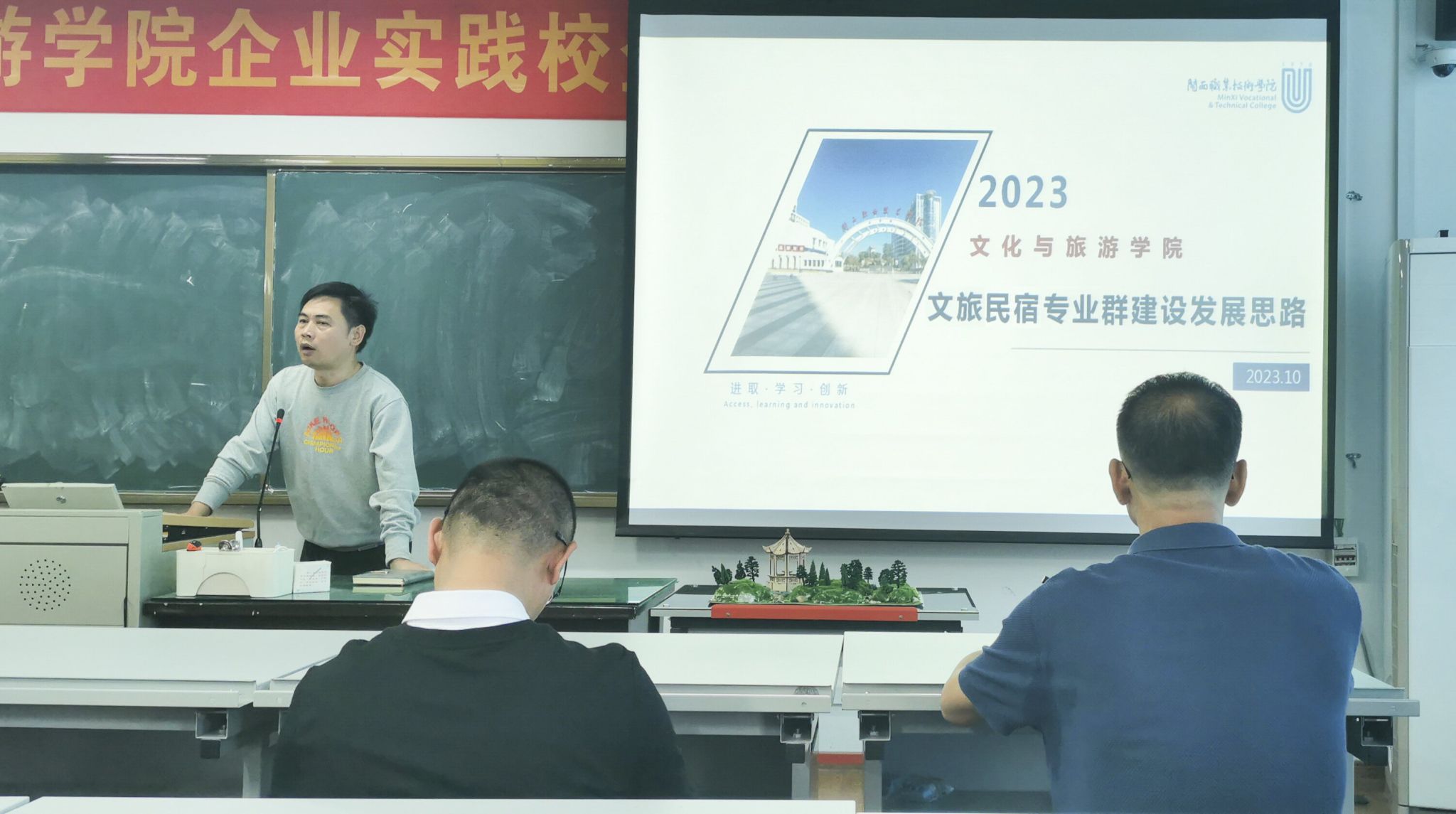 2023年10月24日,文化与旅游学院在万源楼1010室召开“文旅民宿专业群建设发展工作”全体教职工会议。学院领导及时传达了学校党政领导班子对文旅学院发展的关切和期盼,进一步明确了文化与旅游学院聚焦民宿产业的方向和未来规划,号召全体教职工凝心聚力,攻坚克难,找准专业和课程在文旅民宿专业群中的定位,加强推进模块化教学改革,全力建设高水平专业群,打造予生最好学校。