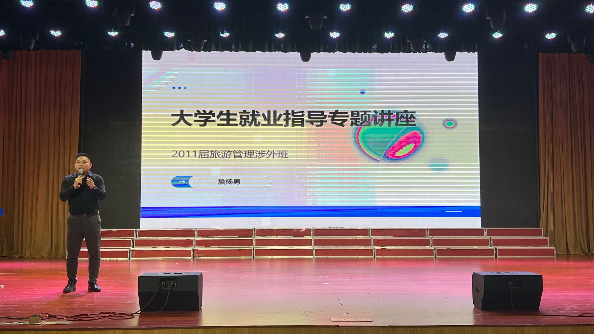 在当前就业形势日益复杂多变的背景下,为有效提升我院学生的职业规划意识和就业竞争力,文化与旅游学院于2024年5月28日下午在大匠堂成功举办了“大学生就业指导专题讲座”。本次讲座邀请了2014届旅游管理涉外班优秀校友代表詹杨男围绕就业经历、工作经验、职业规划与发展路径等主题进行了深入浅出的讲解与分享,22级全体学生共计750余人参加了本次专题讲座。