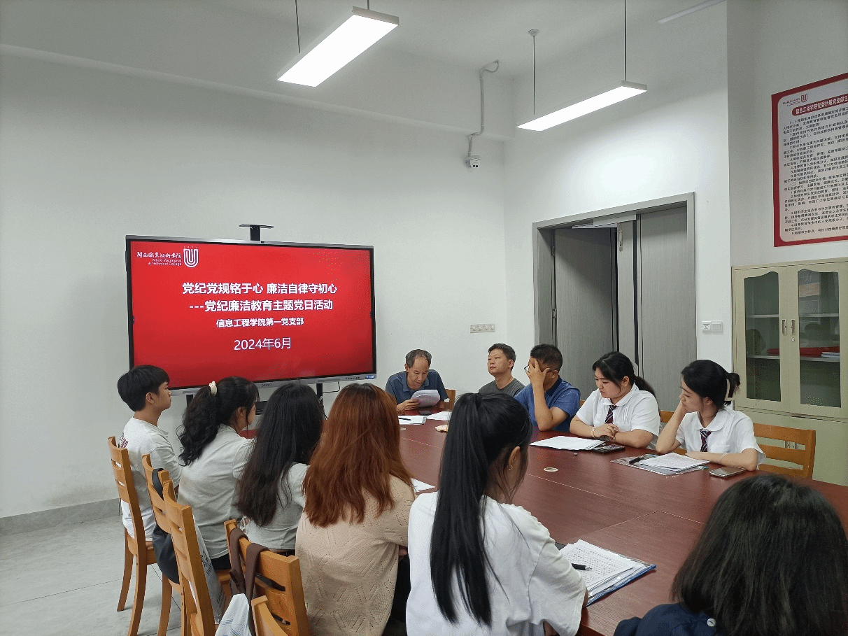 随着毕业季的到来,在2024届毕业生即将踏上人生新征途之际,信息工程学院第一党支部于2024年6月开展了主题为“党纪党规铭于心 廉洁自律守初心”的党日活动,旨在加强支部党员党性修养,增强守纪律、讲规矩意识, 增强拒腐防变能力和廉洁从业意识,勉励毕业生党员把遵规守纪铭记于心,以廉洁自律为立身之本,牢筑信仰之基,踏实、稳健走好人生“第一步”,开启人生新征程。