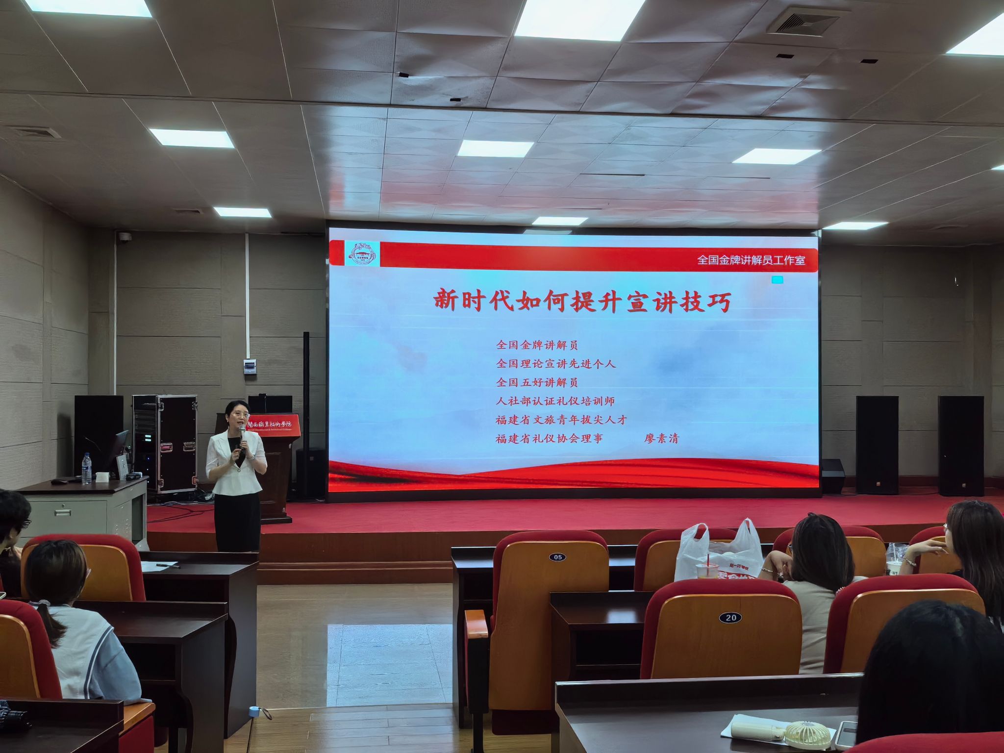 廖素清女士是深耕红色文化宣讲领域的佼佼者,她巧妙地将龙岩的红色资源与新媒体技术相结合,打磨出一系列深入人心的宣讲内容。在讲座中,她与同学们积极互动,展示了如何从着装、妆容、肢体动作、语言表达等方面加强宣讲礼仪,还通过分享全国金牌讲解员的参赛经历以及“馆长姐姐说”、“小小讲解员”等优秀视频作品,着重讲解了新时代如何通过精准的内容策划、生动的叙事手法以及有效的互动策略,提升宣讲效果,扩大宣讲传播范围。