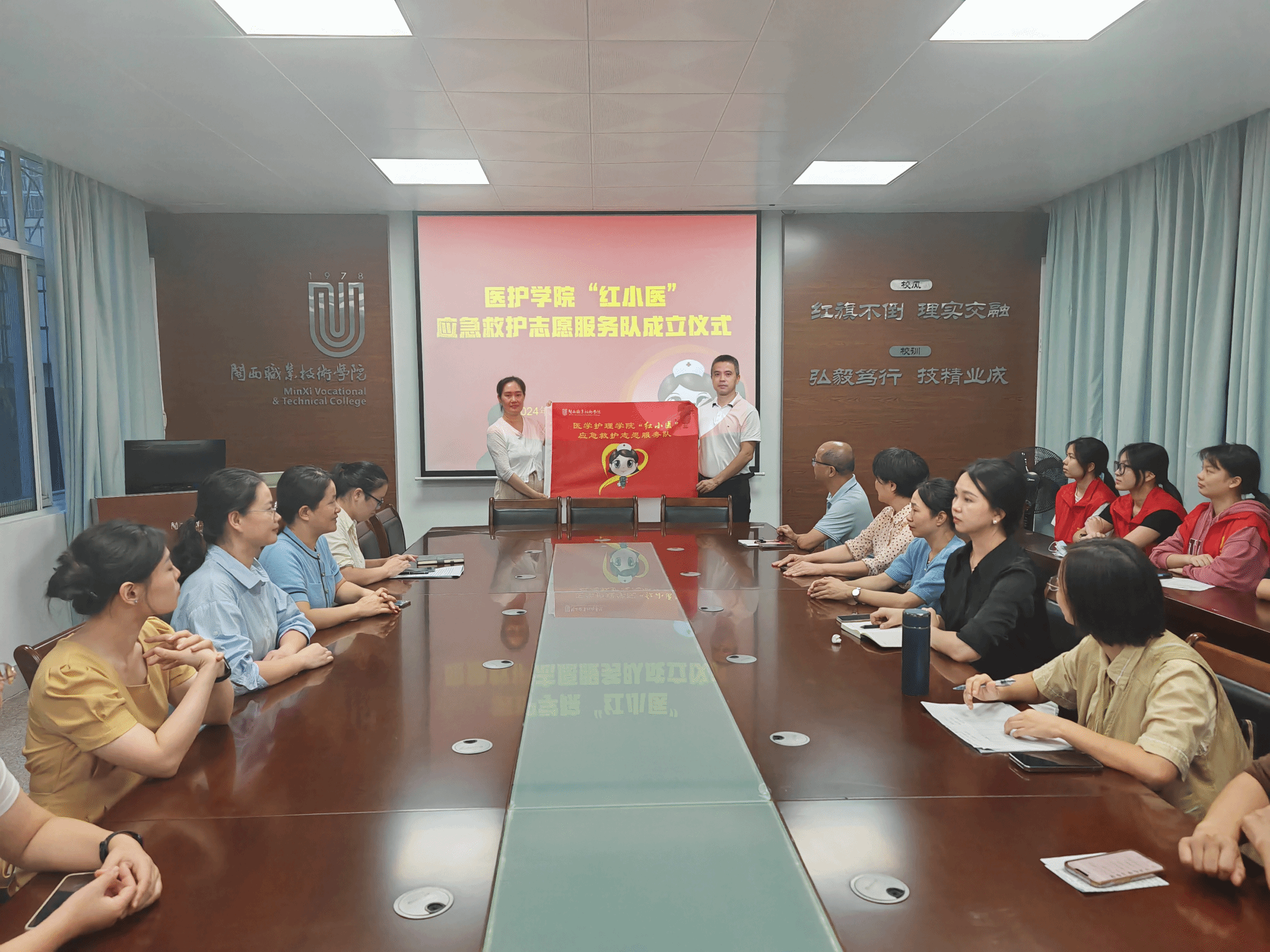 在授旗仪式上,校团委副书记卢素素代表学校应急救护志愿服务队,对医护学院成立“红小医”应急救护志愿服务队表示祝贺。医护学院党委负责人表示,在高质量党建引领下,团学联动起来,“红小医”应急救护志愿服务队将追随红医的脚步,充分发挥医护教师的专业优势,开展形式丰富多样的志愿服务活动,让应急救护知识和技能推广进社区、进企业、进学校、进乡村,在促进居民健康意识增强、应急救护能力提升的同时,汇聚力量助推全民参与“健康龙岩”建设,为我校创建全国急救教育试点学校贡献力量。