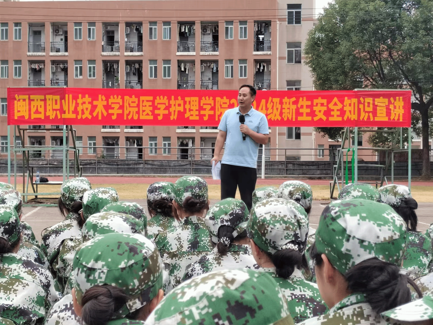 11 月 18 日 ,安全保卫处在天马校区田径场开展安全知识宣讲暨消防实战演练。安全保卫处全体人员、安保公司相关人员,医学护理学院相关负责人及410余名新生参加,宣讲会由安全保卫处副处长陈文东主持。