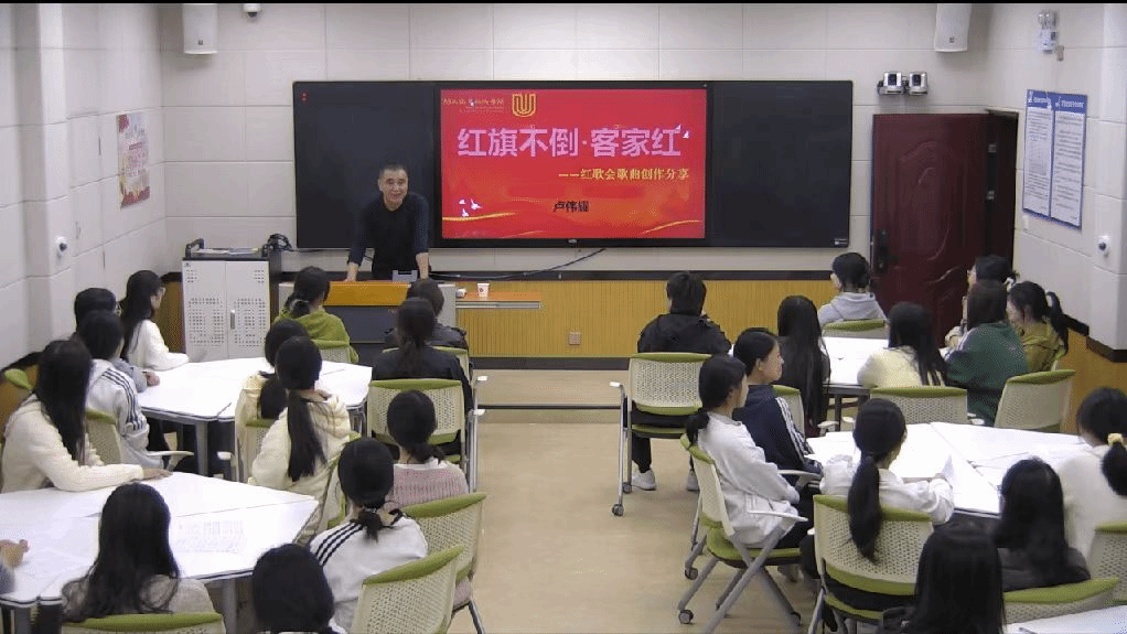 2024年11月24日,一场别开生面的歌曲创作分享活动在望云楼306公共教室开展。校党委书记卢伟耀教育与艺术学院的同学们一同分享歌曲《客家红》的创作故事。