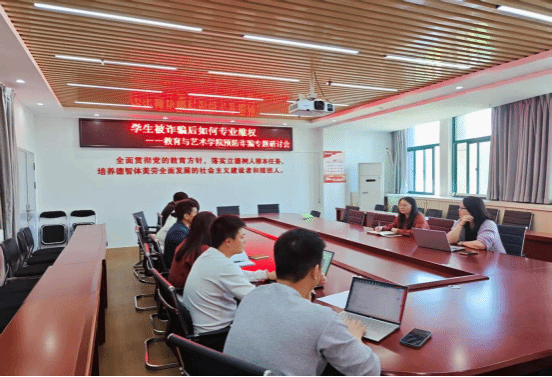 2025年4月15日上午,针对近期学生受骗事件,教育与艺术学院学生工作领导小组以专题研讨的方式召开辅导员例会,邀请相关领域专业老师参与,从法律专业和心理健康教育角度研讨。