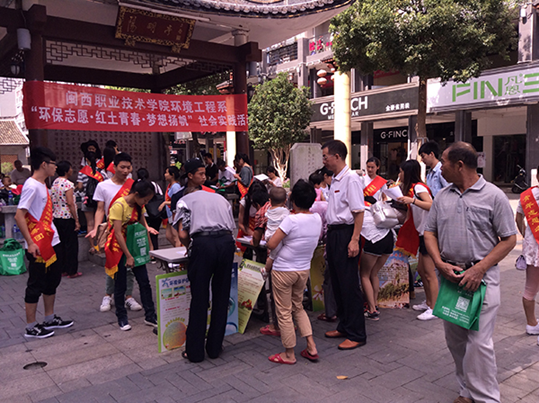 整个活动以“社会环保宣传”为主,结合学院招生宣传工作。在瓦子街文庙前搭建了大本营,挂起“环保志愿·红土青春·梦想扬帆”和“呵护水源地,关注饮水安全”两条横幅,左右两边共树起13块宣传展板,在中间的桌子上堆满了装满相关宣传资料的宣传袋。前来参观并咨询的群众一下蜂拥而来,师生们发放宣传材料、接授咨询、指导环保问卷调查等,忙得不亦远乎!部分同学以瓦子街为主干结合周边街道对店面和行人进行宣传,使瓦子街变得更加热闹。