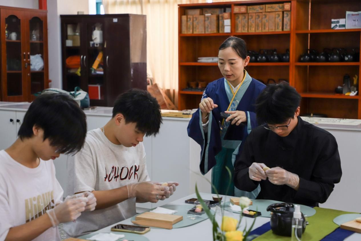 校外非遗茶果子传承人吴晓露、古琴与茶道技艺传承人黄熹冉两位老师,通过“文化讲堂+示范教学+分组实践”的形式展开教学。讲堂上,老师将茶艺、古琴、茶果子文化紧密结合,详细讲解宋代茶果子文化、闽西地域特色等历史渊源,并结合园林美学解析造型设计思路;实操环节中,从揉面调色到包馅塑形,老师们分步演示制作流程,重点指导学生将花卉、山水等园林元素融入造型。学生们分组创作时,充分运用风景园林设计中的对称、层次、色彩搭配等理念,赋予茶果子独特的艺术美感,最终完成的作品引得师生驻足欣赏。