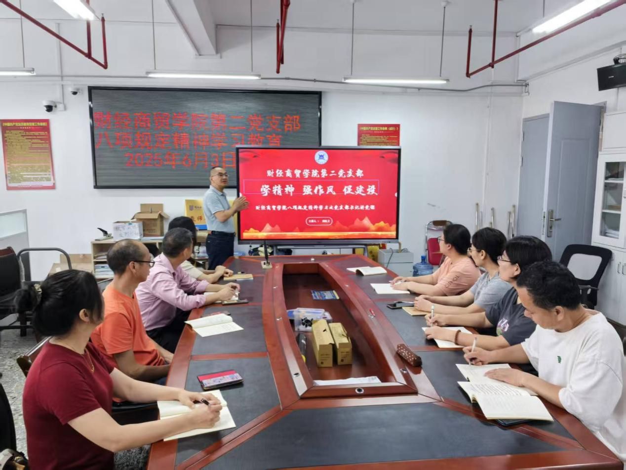 开展中央八项规定精神学习是财经商贸学院第二党支部今年党建工作的一项重中之重的任务。支部将持续通过“三会一课”、主题党日、参观学习等活动形式将学习融入日常、抓在经常,持续推动中央八项规定精神入脑入心。我们坚信,中央八项规定精神学习必将转化为推动支部以及挂钩专业建设高质量发展的强大动力。