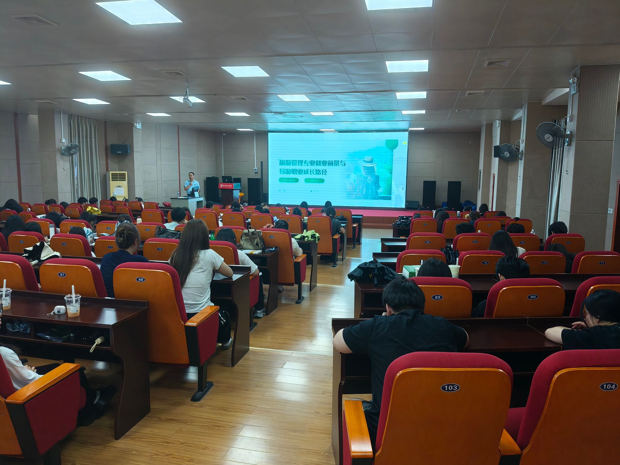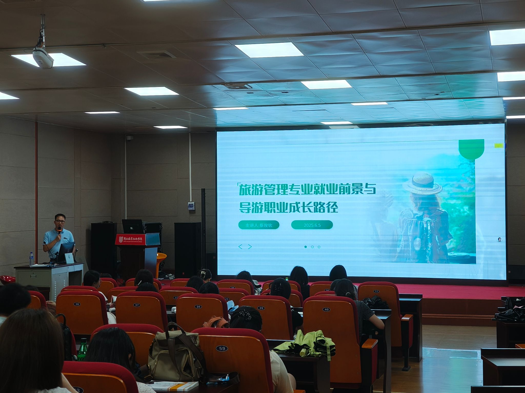 2025年6月5日,文化与旅游学院特邀2018届旅游管理专业优秀毕业生蔡俊钦为23、24级旅游管理专业学子带来主题为《旅游管理专业就业方向和导游的职业成长路径》的精彩讲座,为同学们的职业发展指引方向。