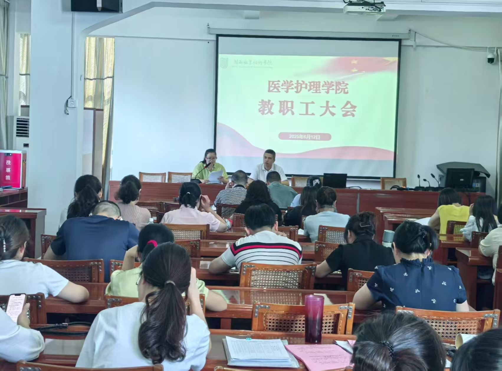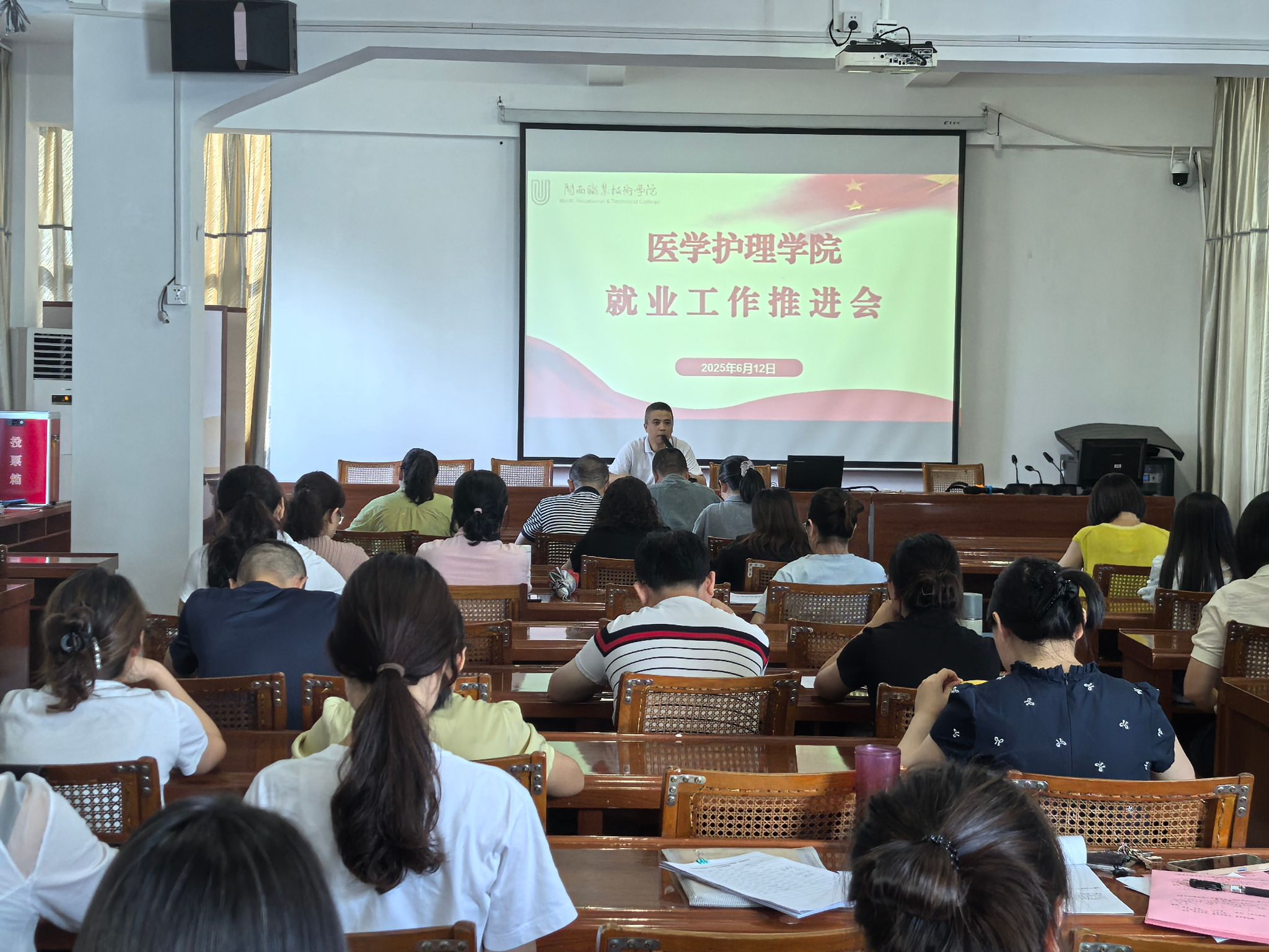 6月12日下午,医学护理学院在天马校区五楼会议室召开全体教职工大会暨2025届毕业生第四次就业工作推进会,学院党政班子成员、全院教职工参加会议,会议由党委书记邱伟彬主持。