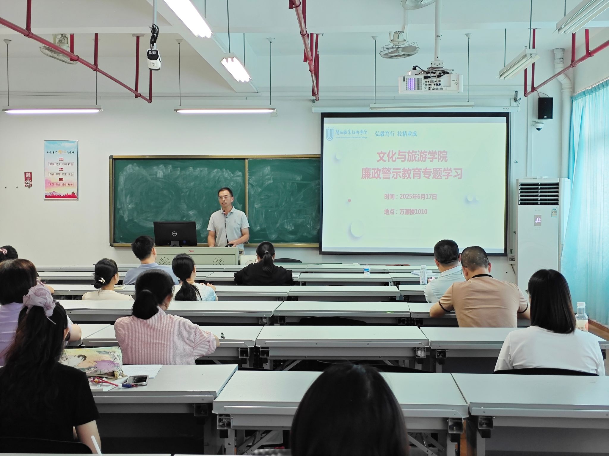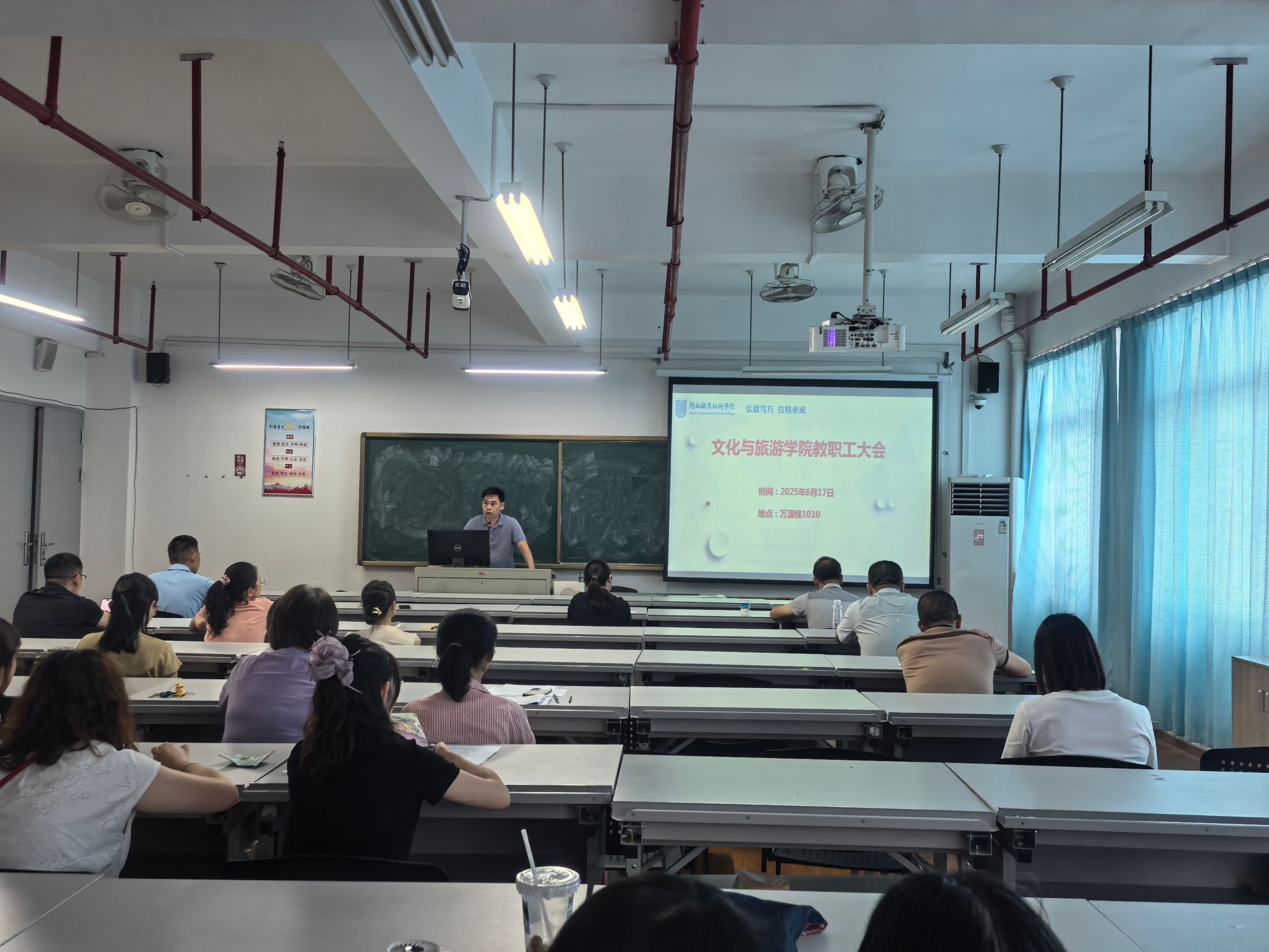 2025年6月17日,文化与旅游学院于万源楼召开全院教职工大会,院党委副书记主持,全体教职工参会。