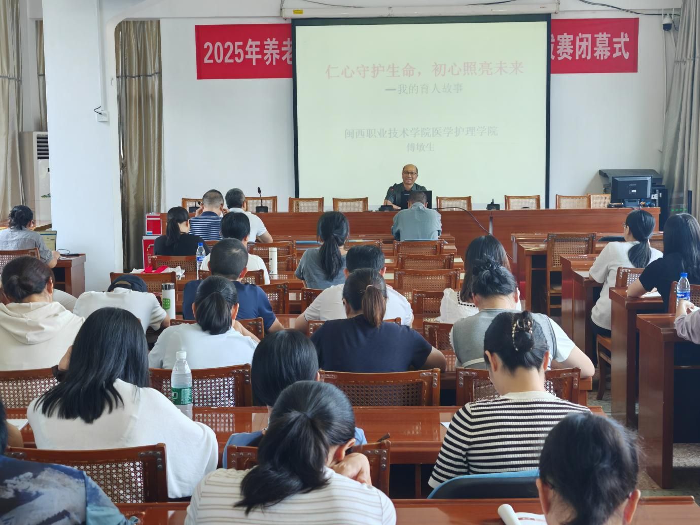 会上,新罗区“见义勇为”个人、我院中医康复技术专业教师傅敏生以“我的育人故事:仁心守护生命,初心照亮未来”为主题开展专题分享会,结合自身 28 年教育生涯,讲述三尺讲台与急救现场“两片课堂”里的育人初心与使命担当,充分彰显了学校作为第二批全国学校急救教育试点学校的建设成效。