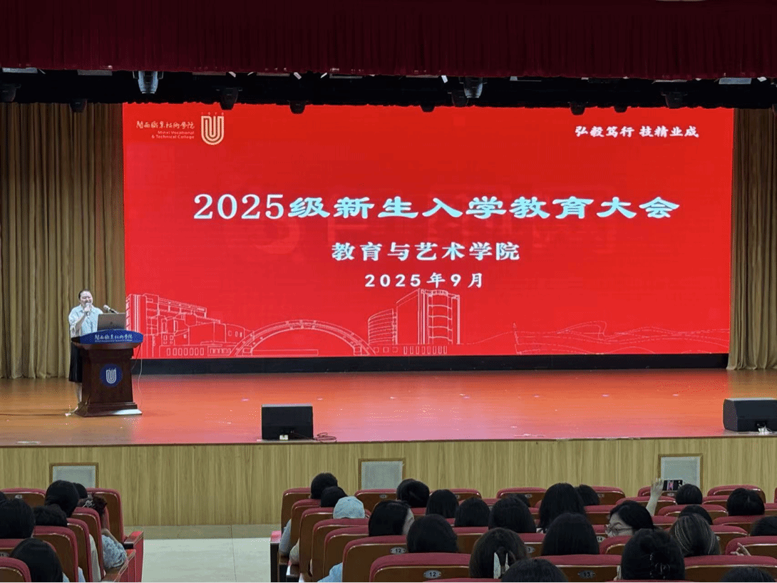 2025年9月7日,教育与艺术学院2025级新生入学教育大会在大匠堂举行。院领导班子、各专业主任、支部委员、2025级全体辅导员、全体新生及2024级学生代表参加本次大会。