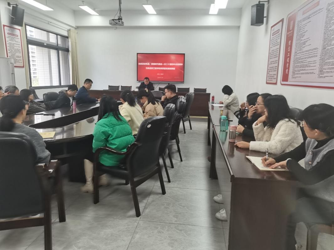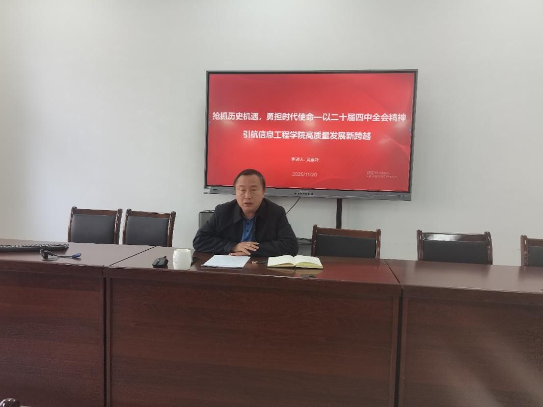 11月20日下午,信息工程学院召开党的二十届四中全会精神专题宣讲会,全体教师参会,学院院长黄素叶以“抢抓历史机遇,勇担时代使命,以全会精神引航高质量发展新跨越”为题作宣讲。