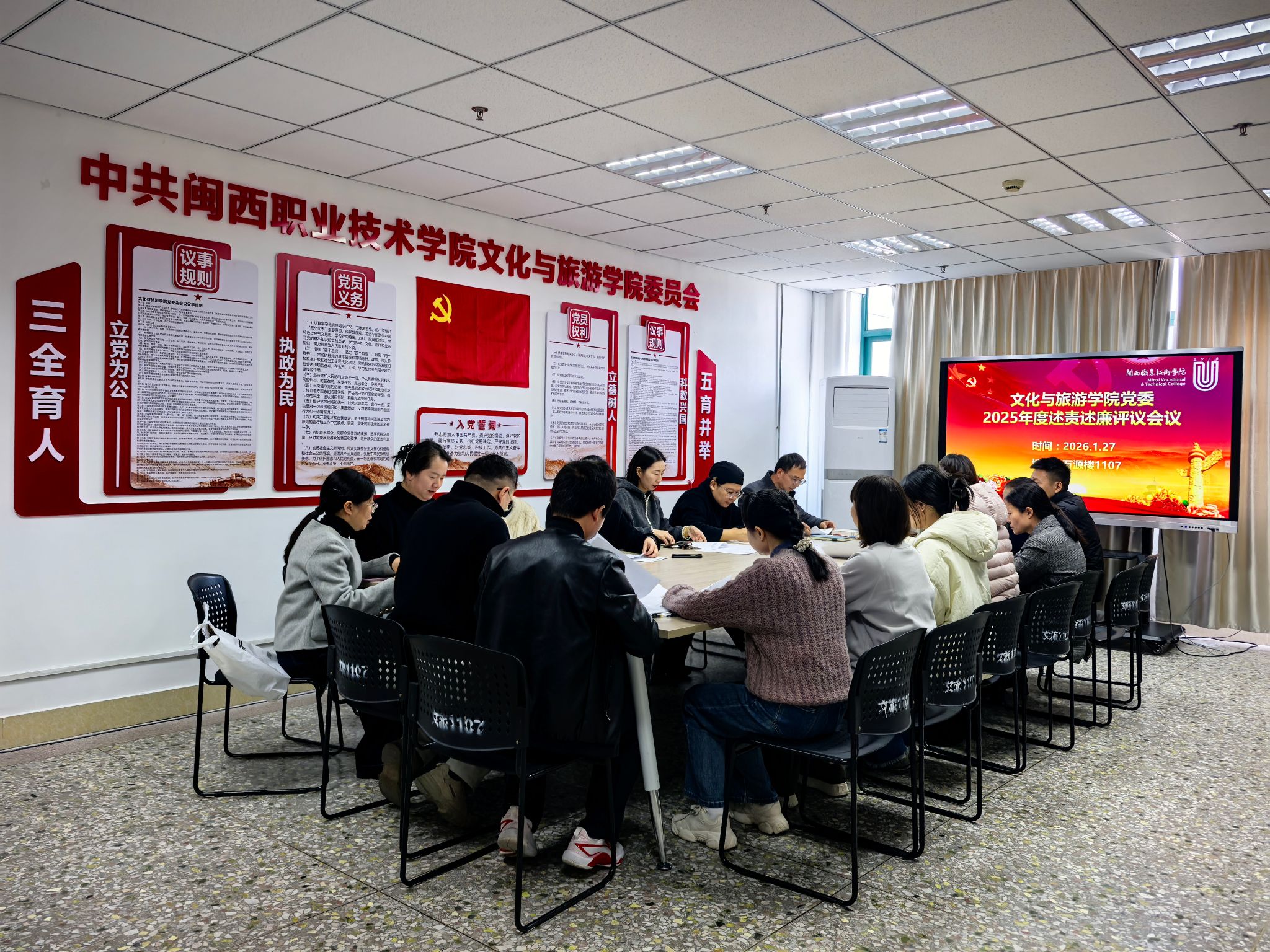 为深入推进全面从严治党,压紧压实管党治党政治责任,1月27日,文化与旅游学院党委在万源楼1107会议室召开2025年度述责述廉评议会。学院党委领导班子成员、专业主任及支部书记参加会议,会议由学院党委书记主持。