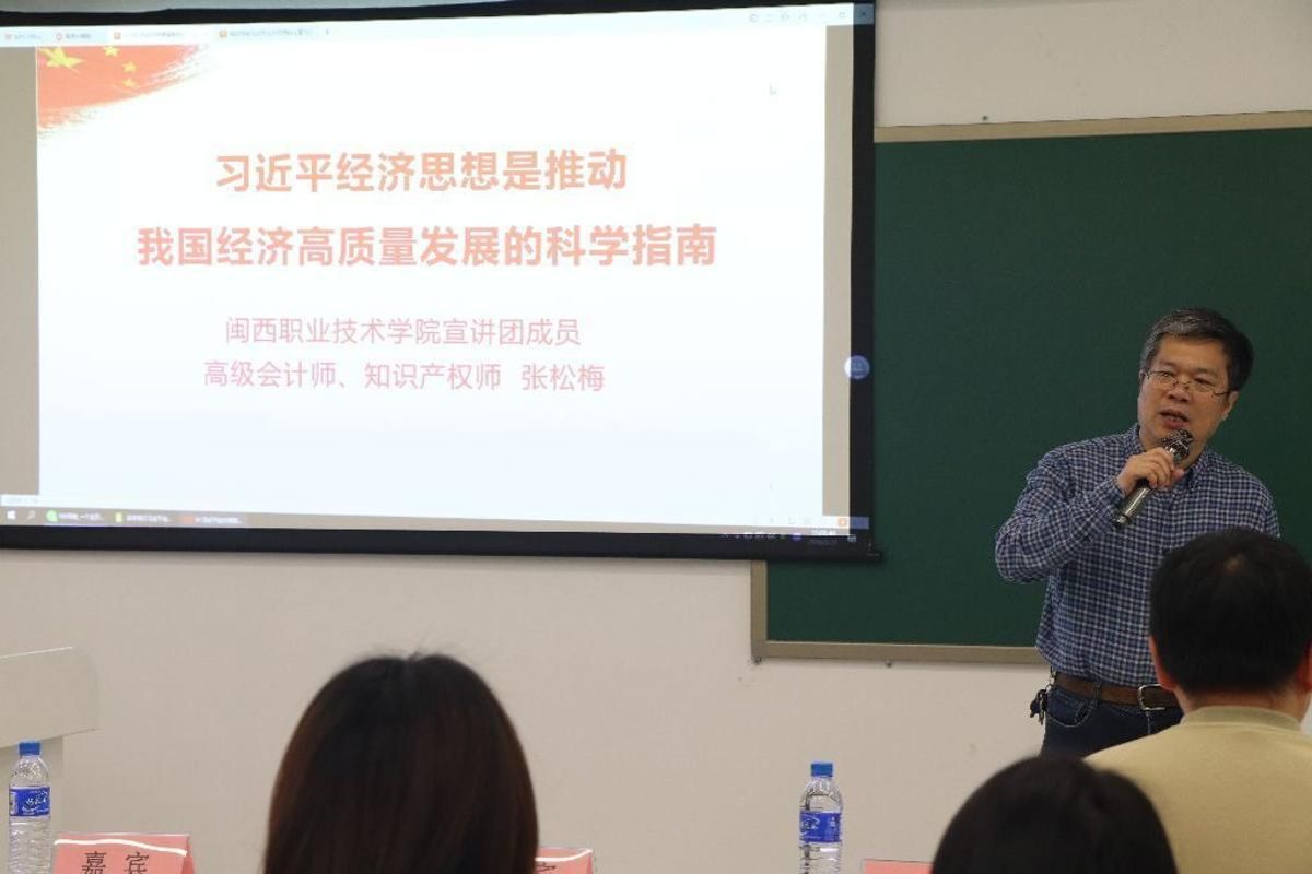 为深入推动习近平经济思想进教材进课堂进头脑,根据学校宣传部(统战部)、财经商贸学院党委、马克思主义学院、校离退休党总支联合安排,2026年3月31日下午,我校宣讲团成员、校离退休党总支第一支部党员、高级会计师、知识产权师张松梅同志,在万源楼实训室E为财经商贸学院团员学生代表等开设学习宣传习近平经济思想系列专题讲座。