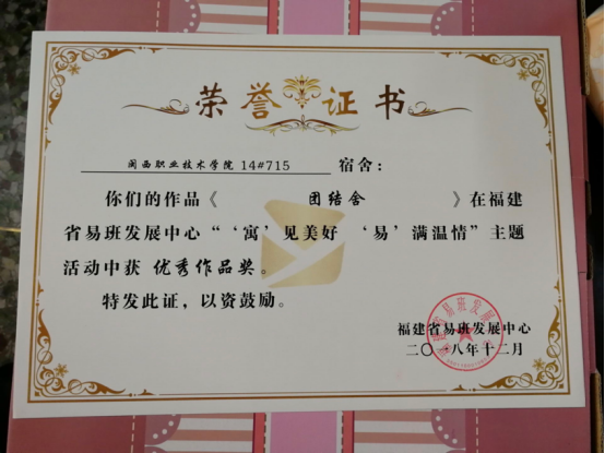 日前,我校组织各学生宿舍参加福建省易班发展中心“‘寓’见美好,‘易’满温情”主题活动。经过激烈的角逐,财经商贸学院18级电子商务(2)班14#715宿舍(成员:陈松萍、陈家慧、丁思洁、苏彩泓、苏欣茹、庄艳萍)的作品《团结舍》,获“优秀作品奖”。该作品为我校参加本次活动的唯一获奖作品。此次活动加强了宿舍文化建设,提升宿舍文明水平,展现当代大学生创新意识及团队风貌。