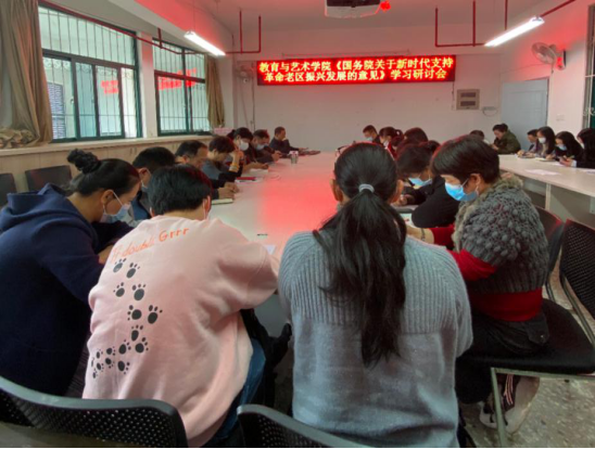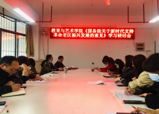 为了深入贯彻落实党中央、国务院决策部署,支持革命老区在新发展阶段巩固拓展脱贫攻坚成果,开展“再学习、再调研、再落实”活动,2月28日,教育与艺术学院在综合楼8楼召开《国务院关于新时代支持革命老区振兴发展的意见》学习研讨会。