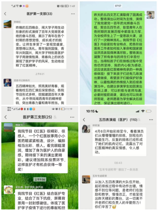 医护第二党支部书记潘继勇说,整场演出以时间为主线,演绎了我党建党一百年的光辉奋斗历程,契合五四节点,彰显青年人在各时期的发展历程中都是生力军,为全校师生上了一堂思政大课,进行了一次精神洗礼。我院节目《红医》内容紧扣专业特点,把各阶段医务工作者如何投入革命和国家建设洪流表现得淋漓尽致。整场演出凝聚了所有参与的师生们辛苦付出。