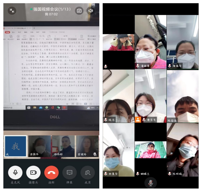 当前,为避免交叉感染,新年伊始,医学护理学院党委利用“学习强国”学习平台的“强国视频会议”功能在线召开了一次“全员”党支部书记工作例会,院党委委员、3个党支部9位党务干部参加。