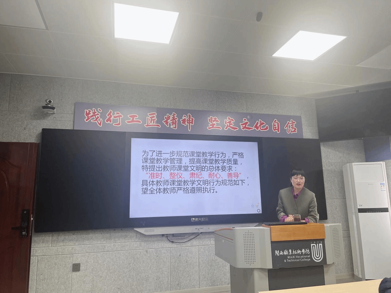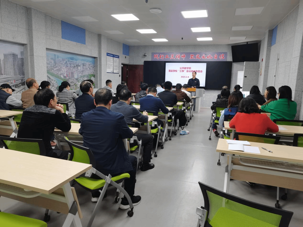 2月8日,公共教学部为贯彻落实学校“深学争优、敢为争先、实干争效”行动会议精神及传达《“‘三教’改革攻坚年”课堂教学改革实施指导性意见(初稿)》,在望云楼智慧教室召开教职工大会,部署新学期工作。分管领导刘路永副校长和教务处张源峰处长参加会议,并做了主旨发言。