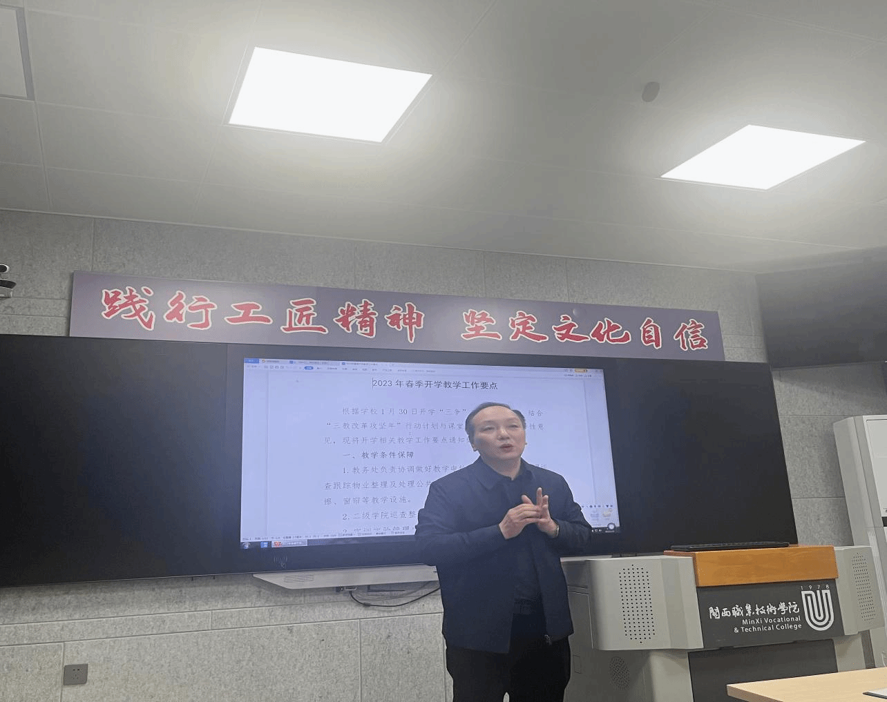 张源峰处长为公教部教师解读《“‘三教’改革攻坚年”课堂教学改革实施指导性意见(初稿)》和2023年春季开学教学工作要点。要求老师落实“三争”精神,展现“做实、做细、争上游”的精神面貌;用情用心做好教学工作,积极参加教学能力竞赛,提升个人能力;贯彻以学生为中心的理念,落实人才培养方案,让学生“干一行爱一行”。特别强调全体教师要按照“2023年三教改革攻坚年”课堂教学改革指导性意见(初稿)要求,落实落细课堂教学成效评价。