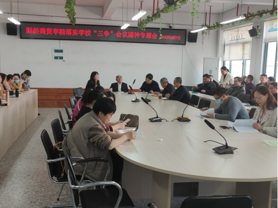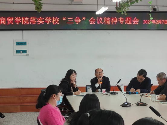 为贯彻落实省委“深学争优、敢为争先、实干争效”行动要求及学校“三争”会议精神, 2023年2月7日下午,财贸学院召开教职工大会,研究部署新学期重点项目工作,校纪委书记、财贸院挂钩领导温献荣、财贸学院领导班子及全体教职工参加会议。会议由财贸学院李宝生书记主持。
