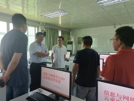 为了快速构建一个高效、安全、统一的计算机教学实验管理平台,提升信息化教学水平,更好地服务于学校师生教学工作。2022年9月1日上午,信息与网络中心组织全体技术人员在望云楼604机房学习培训《IDV云桌面机房》技术操作。培训期间,刘路永副校长莅临我部门指导。